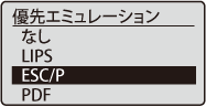動作モードの自動切り替えを設定した状態で、本プリンターがコントロールコマンドを識別できなかった場合に、優先的に切り替える「優先エミュレーション」を設定しておくことができます。この設定を印刷するデータに合わせて「ESC/P」や「LIPS」、コントロールROM(オプション)のエミュレーションモードに変更します。工場出荷時の設定は「なし」に設定されています。