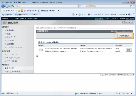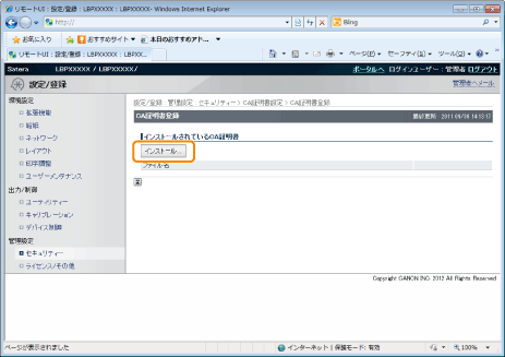 プリンターにインストールしたCA証明書ファイルを本プリンターで使用できるようにする場合は、CA証明書ファイルのインストールが完了したあと、「
