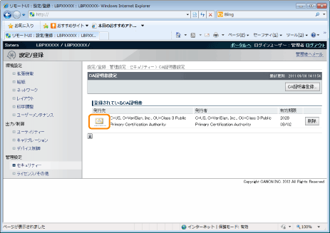 検証結果画面で「検証時にエラーが発生しました。」と表示された場合、このCA証明書を使用することができません。CA証明書を削除したあと、新しいCA証明書を登録してください。