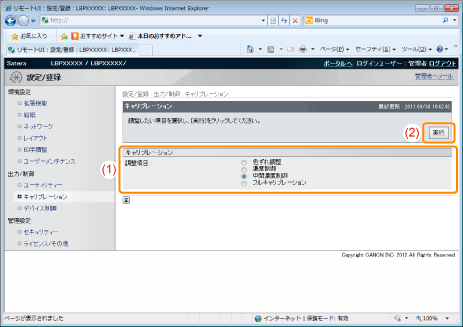 ]で「色ずれ調整」、「濃度制御」、「中間濃度制御」、「フルキャリブレーション」から調整したい項目を選択して、[OK]を押します。