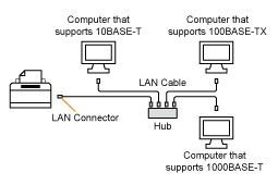 Use a Category 5 or higher twisted pair cable for the LAN. If you want to connect the printer to a 100BASE-TX or 1000BASE-T Ethernet network, all the devices to be connected to the LAN (hub, LAN cable, and network board for computer) must support 100BASE-TX or 1000BASE-T.