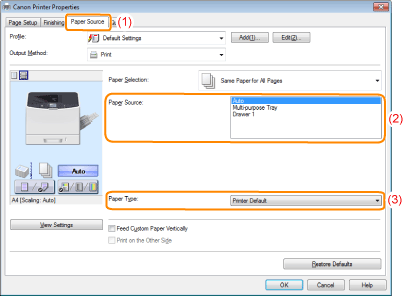 Using Preview to specify a paper sourceYou can also specify a paper source by clicking each paper source or [Auto] using Preview when [