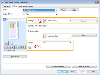 Prints on one or both sides of the paper. The default setting for [Print Style] is [2-sided printing].
