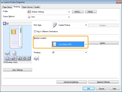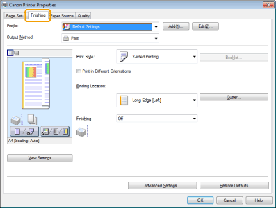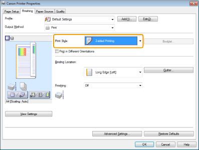 The default setting for [Print Style] is [2-sided Printing]. You can also change the default setting to [1-sided Printing]. For instructions on changing the default settings, see "Configuring the Default Print Settings."
