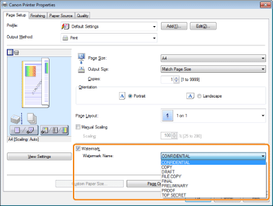 You can print a watermark (such as "CONFIDENTIAL" or "COPY") on a document created using an application. You can also register customized watermarks in addition to the predefined watermarks.