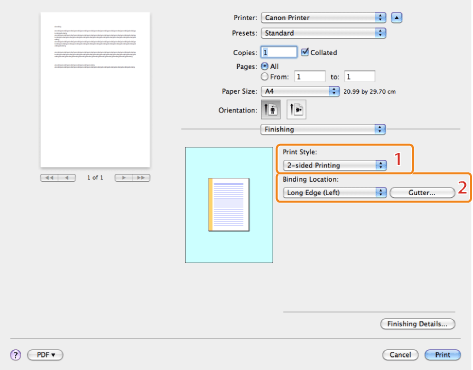 Prints on one or both sides of the paper. The default setting for [Print Style] is [2-sided printing] (see "1-sided and 2-sided Printing").