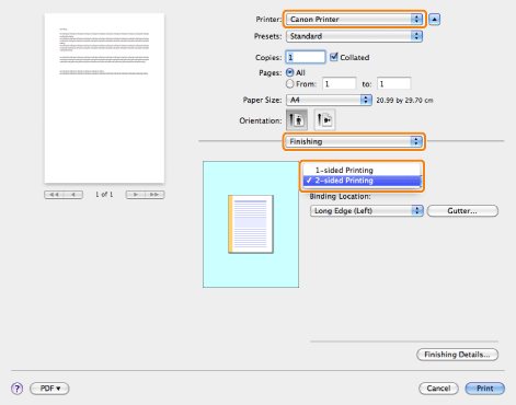 Select your printer from [Printer] → [Finishing] → Select [1-sided Printing] or [2-sided Printing] from [Print Style].
