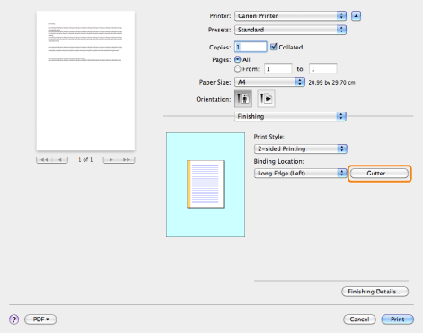 The default setting for [Print Style] is [2-sided printing]. You can save the 1-sided printing setting as a preset. For details, see " Using [Presets] for Printing."