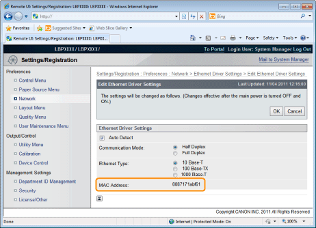 Network Status Print is printed. The MAC address (A) is indicated in [Ethernet Driver Settings] on the upper left of the Network Status Print.