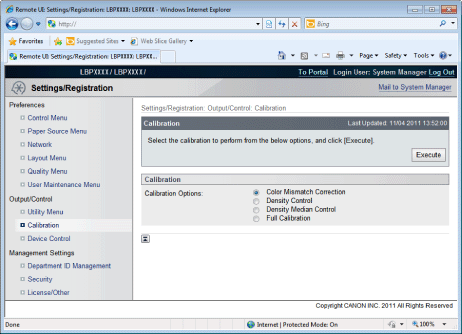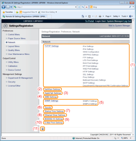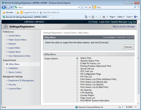 [Settings/Registration]You can set/change the various printer settings. The items that can be set/changed differ depending on whether you log in as administrator or end user.