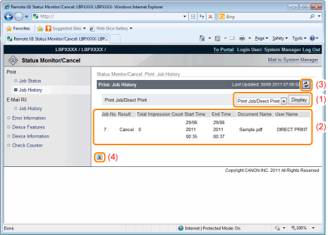 Display Job HistoryThe output job history list is displayed.
