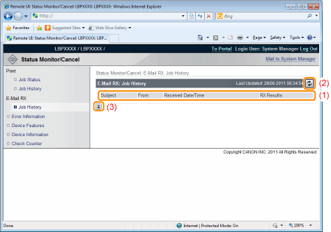 Display Job HistoryThe received e-mail history list is displayed.