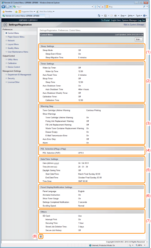 [System Manager Information]Information about the registered system manager is displayed.