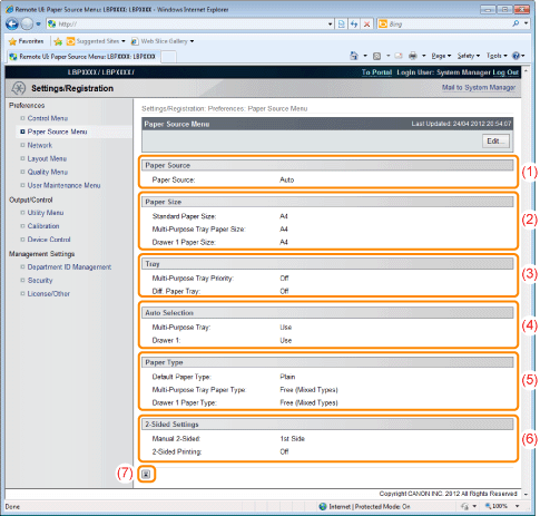 [Auto Selection]It displays whether to recognize the paper source for auto selection when [Auto] is set for [Paper Source] for each paper source.