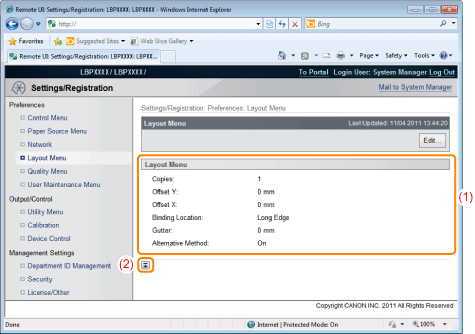[Layout Menu]The settings for number of pages and print appearance are displayed.