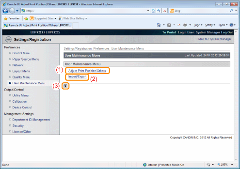 [Adjust Print Position/Others]It displays the print position adjustment settings for each paper source. It also displays the settings for operation and maintenance if a problem occurs.