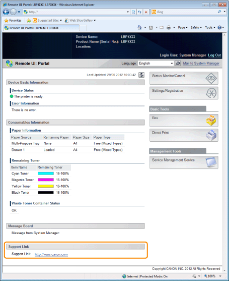 You can post messages from the administrator on a message board on the portal page of the Remote UI. Also, you can set links to information about printer support in the portal page support link, and make it accessible from the Remote UI when necessary.