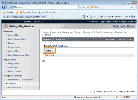 To enable the printer to use the CA certificate installed on the printer, after the CA certificate installation is complete, refer to "Registering CA Certificates in the Printer" and register the CA certificate in the printer.