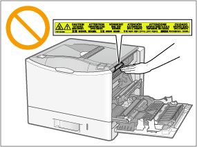 ![]() Quando si rimuove la carta inceppata oppure quando si ispeziona la parte interna della stampante, non esporsi per un periodo di tempo prolungato al calore emesso dall'unità di fissaggio o dalle parti circostanti. Se non ci si attiene a questa avvertenza ci si potrebbe bruciare, anche senza toccare direttamente l'unità di fissaggio o le parti circostanti.