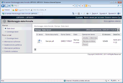 Lo stato della stampante si può conoscere anche dalla pagina [Monitoraggio stato/Annulla] della IU Remota.