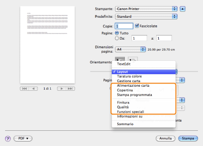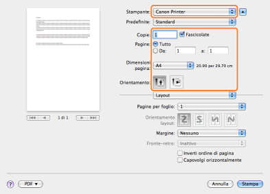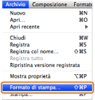 In Mac OS X 10.5 e successivi, la finestra [Formato di stampa] potrebbe non essere visualizzata in base all'applicazione utilizzata. In questo caso, passare al punto 4. Nella finestra [Stampa] è possibile specificare le opzioni [Dimensioni], [Orientamento] e [Scala].