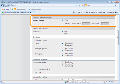 Selezionare [Pagine] e inserire il numero della pagina iniziale e quello della pagina finale per impostare l'intervallo delle pagine da stampare.