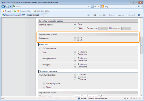 Specificare il processo di gradazione per la stampa dei dati. È consigliabile impostare [Alto 1] quando si stampano fotografie a livello di qualità standard e di impostare [Alto 2] quando si stampa a una qualità superiore.