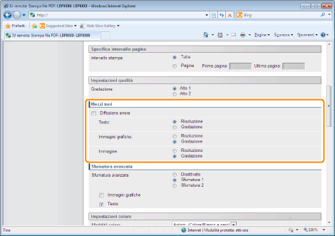 Quando la [Diffusione errore] non è selezionata, è possibile selezionare il metodo di visualizzazione dei mezzitoni da [Risoluzione] o [Gradazione] per [Testo], [Immagini grafiche] oppure [Immagine].