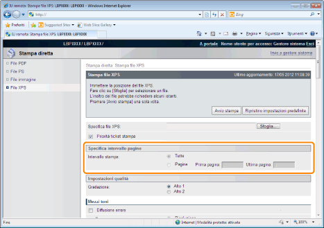 Selezionare [Pagine] e inserire il numero della pagina iniziale e quello della pagina finale per impostare l'intervallo delle pagine da stampare.