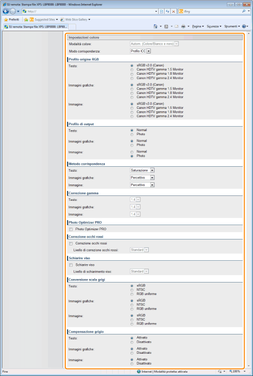 Consente di impostare quale metodo di corrispondenza colori applicare per ogni parte di un lavoro di stampa (testo, grafici o immagini) o per ciascuno spazio colori, quali RGB o CMYK. È possibile scegliere se utilizzare per l'elaborazione metodi quali profilo ICC e gamma. Gli elementi che possono essere impostati dipendono dal tipo PDL.