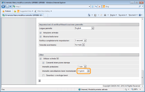 È possibile eliminare automaticamente i lavori memorizzati impostando il periodo di tempo che deve passare tra la memorizzazione e l'eliminazione dei lavori stessi.