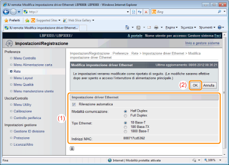 Se si desidera definire le impostazioni per il metodo di comunicazione e il tipo di Ethernet, deselezionare la casella di controllo [Rilevazione automatica] ed eseguire le impostazioni seguenti. Utilizzando [Modalità comunicazione], selezionare il metodo di comunicazione Ethernet corrispondente all'ambiente di rete in uso.