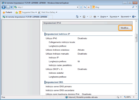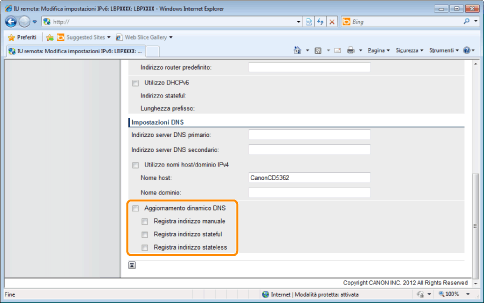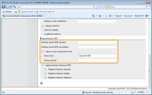 Selezionare la casella di controllo [Utilizzo nomi host/dominio IPv4] per utilizzare lo stesso nome host e nome di dominio di IPv4. Dopo aver riavviato la stampante, il nome host e il nome di dominio impostati da IPv4 vengono impostati automaticamente.