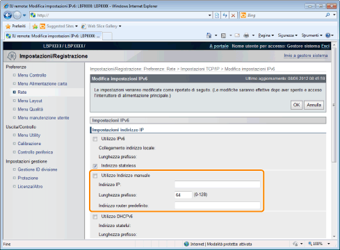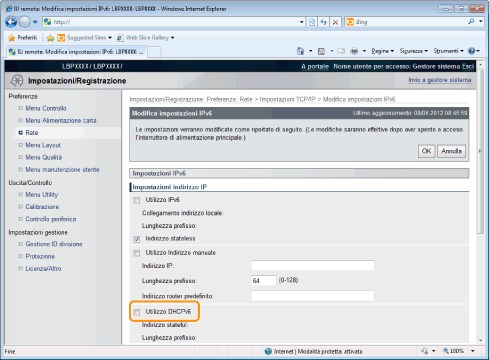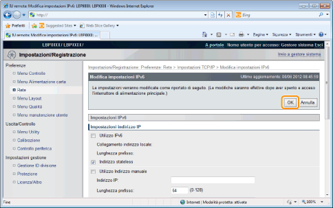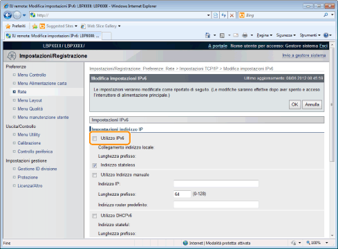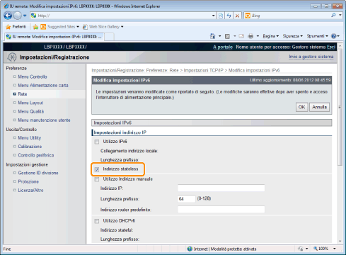 Conservazione dell'indirizzo statelessDopo aver selezionato la casella di controllo [Indirizzo stateless] e aver riavviato la stampante, l'indirizzo stateless viene visualizzato automaticamente. Questo indirizzo stateless viene eliminato quando la stampante si spegne.