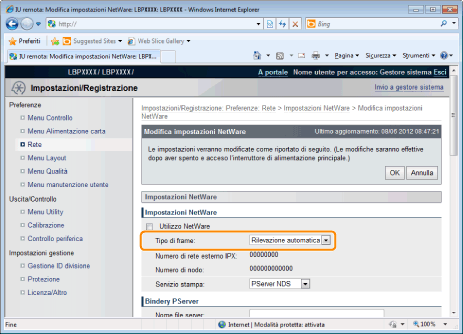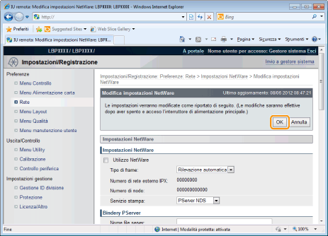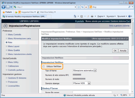 Nell'IU Remota è possibile specificare le impostazioni accedendo alla stampante in rete da un browser.