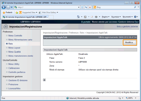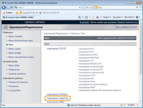 Nell'IU Remota è possibile specificare le impostazioni accedendo alla stampante in rete da un browser.