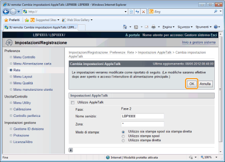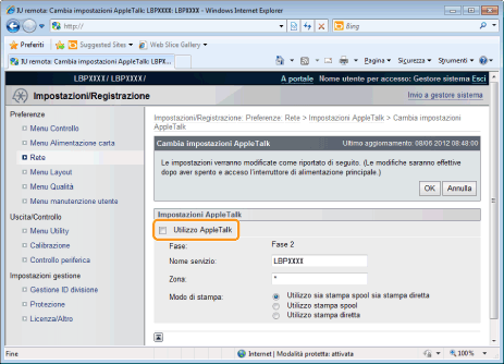 Quando si deseleziona la casella di controllo [Utilizzo AppleTalk]La stampante non viene rilevata sulla rete AppleTalk.