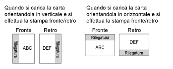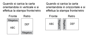 Specifica qual è il bordo della pagina su cui andrà la rilegatura (lato lungo o lato corto). Nella stampa fronte/retro, la stampante regola automaticamente la posizione della rilegatura in base alla superficie dei fogli.