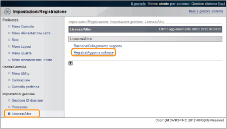 Dalla pagina principale della IU Remota, fare clic su [Impostazioni/Registrazione] → [Licenza/Altro] → [Registra/Aggiorna software].