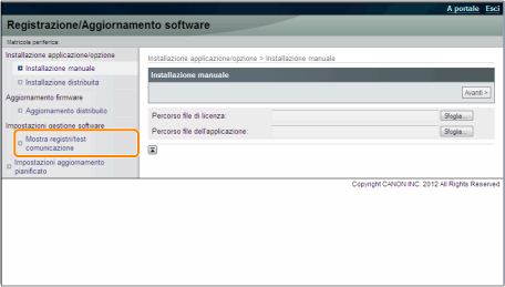 Dalla pagina principale della IU Remota, fare clic su [Impostazioni/Registrazione] → [Licenza/Altro] → [Registra/Aggiorna software].
