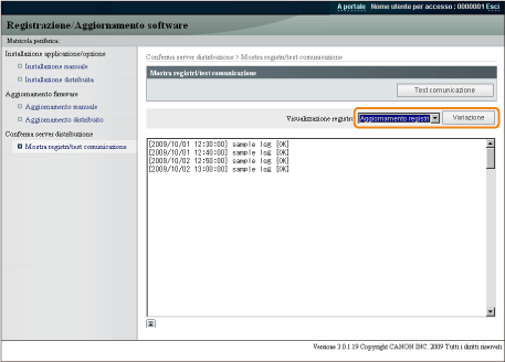 Vengono visualizzati i registri log dell'installazione delle opzioni di sistema/applicazioni MEAP e il registro log di aggiornamento del firmware.