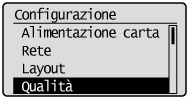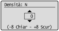 Per regolare la densità del tonerRegolando la densità del toner poco alla volta, stampare i dati che risultavano difettosi dal computer, quindi controllare il risultato della stampa. Se non si riesce regolare la densità del toner, reimpostare la densità al valore predefinito "0", quindi contattare il rivenditore autorizzato Canon locale.