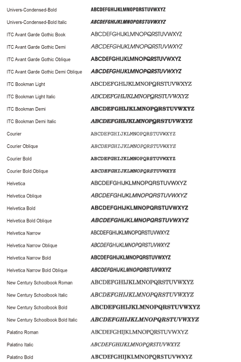 Gli elenchi di caratteri (font) stampati dal [Menu Utilità] sono un elenco completo di tutti i caratteri correntemente disponibili. L'elenco contiene i nomi e i campioni di stampa dei caratteri memorizzati nella stampante.