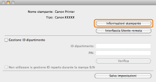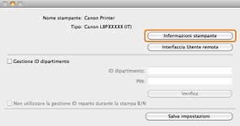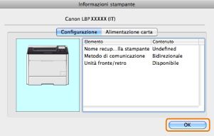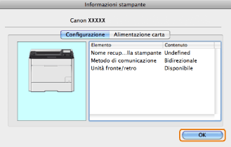 Se il nome del driver della stampante visualizzato nella parte alta della finestra di dialogo [Informazioni sulla stampante] non corrisponde al nome della stampante visualizzato come [Nome reperito dalla stampante], non sarà possibile usare correttamente le funzioni della stampante. Se i nomi non corrispondono, eliminare la stampante aggiunta in [Preferenze di Sistema], poi aggiungerla nuovamente. Per i dettagli, consultare la NOTA (vedere "Guida di installazione del driver stampante").