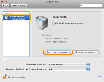Selezionare la stampante → fare clic su [Apri coda di stampa] (oppure [Coda di stampa]).