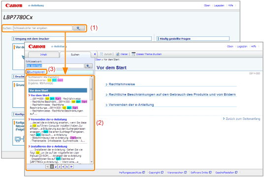 Darüber hinaus steht in der e-Anleitung die UND-Suche zur Verfügung, sodass Sie die Suchergebnisse durch Eingabe von zwei oder mehr Suchbegriffen verfeinern können. Geben Sie bei der Eingabe von Suchbegriffen ein Leerzeichen zwischen den Suchbegriffen ein.
