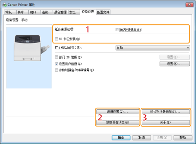 可获取设备信息并更新选项卡中显示的设置(请参阅“设置打印机选项”)。