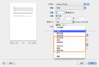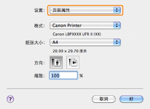在 Mac OS X 10.5 和更高版本中,可能不显示 [页面设置] 对话框,具体取决于所使用的应用程序。在这种情况下,跳至步骤 4。可在 [打印] 对话框中指定 [纸张尺寸]、[方向] 和 [缩放]。