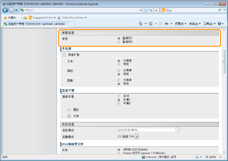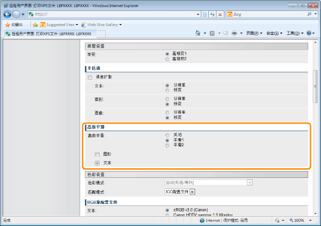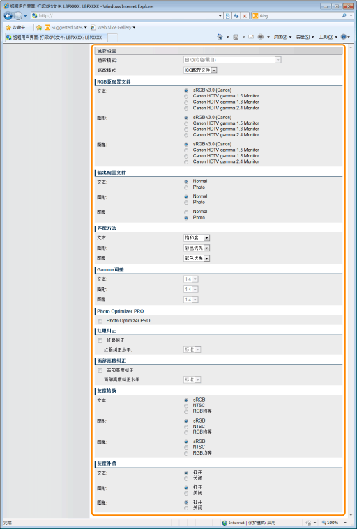 设置组成打印作业的各部分文本、图表或图像或者 RGB 或 CMYK 等各种色彩空间适用的色彩匹配方法。可选择是否使用 ICC 配置文件和 Gamma 处理方法。可设置的项目视 PDL 类型而定。