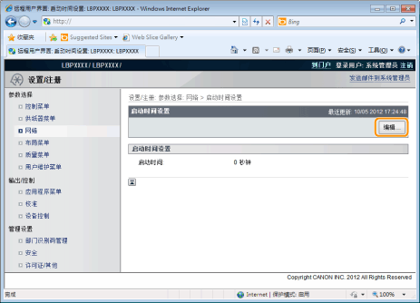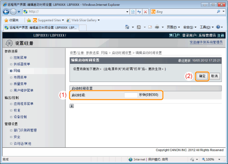 输入从打印机启动到打印机开始通信的启动时间(0 至 300 秒)。